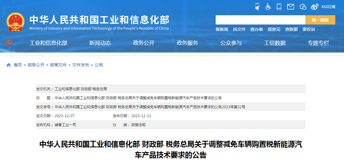 12月11日,工業(yè)和信息化部、財政部、稅務(wù)總局發(fā)布《關(guān)于調(diào)整減免車輛購置稅新能源汽車產(chǎn)品技術(shù)要求的公告》。其中提到,2024年1月1日起,申請進(jìn)入《減免車輛購置稅的新能源汽車車型目錄》的車型,需符合新能源汽車產(chǎn)品技術(shù)要求。還對換電模式車型和企業(yè)自建換電站申報條件提出了新的要求。